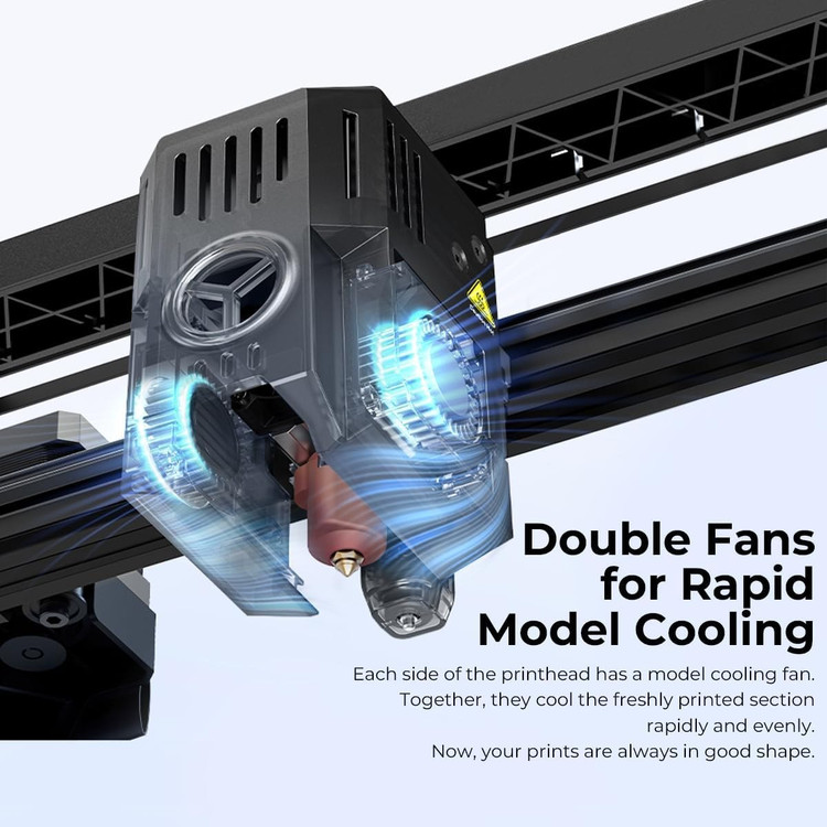 - در دو طرف هد چاپ، یک فن تعبیه شدهاست که بهسرعت و بهطور یکنواخت مدل چاپشده را از دو طرف خنک میکند.